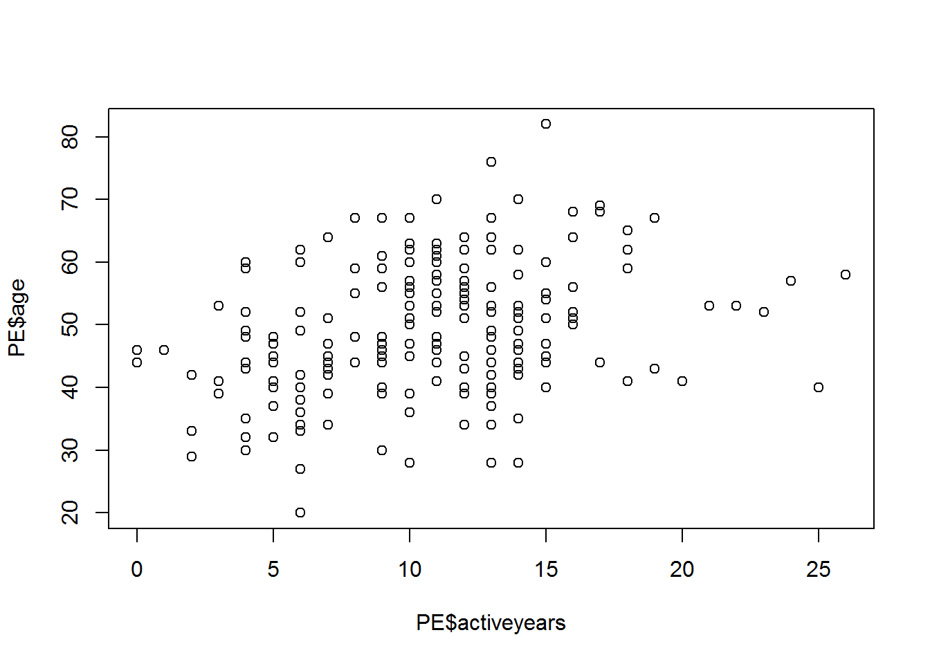 plot(PE$age~PE$activeyears)