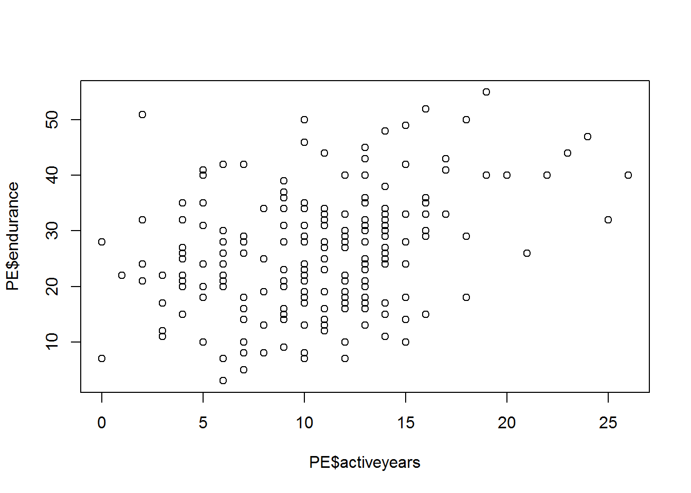 ## data: PE$age and PE$endurance