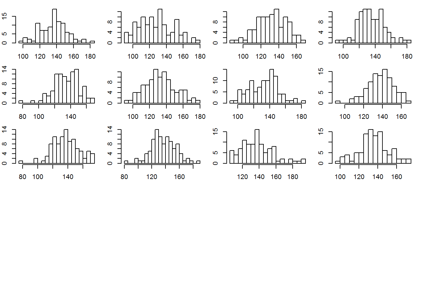 for(s in 1: 12){ hist(y.rep[s, ], xlab = "", ylab = "",