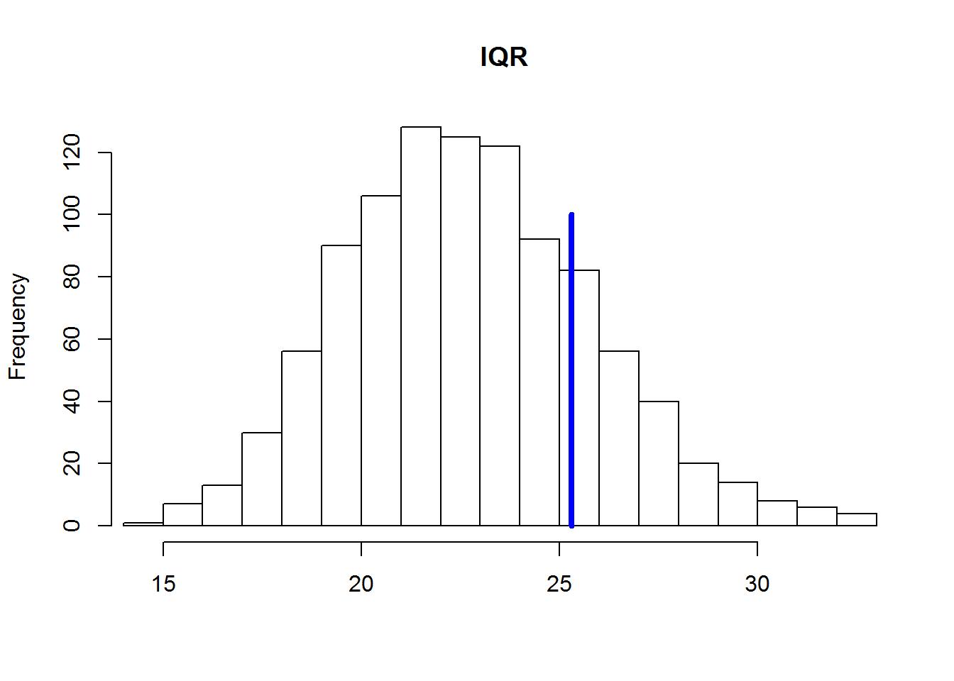 hist(test.IQR, xlim = range(IQR(y), test.IQR), main = "IQR", xlab = "", ylab = "Frequency", breaks = 20)